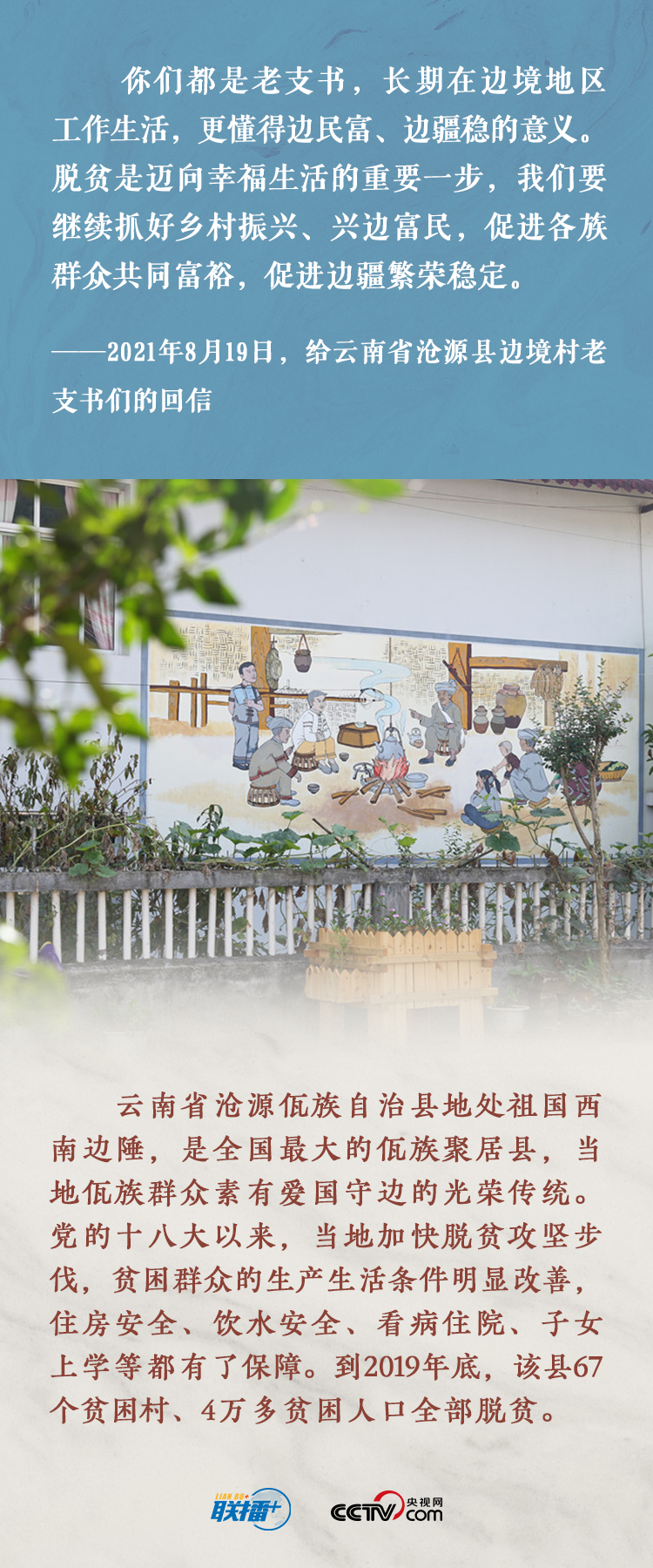 8月19日,习近平总书记给云南省沧源佤族自治县边境村的老支书们回信,勉励他们发挥模范带头作用,引领乡亲们建设好美丽家园,维护好民族团结,守护好神圣国土。